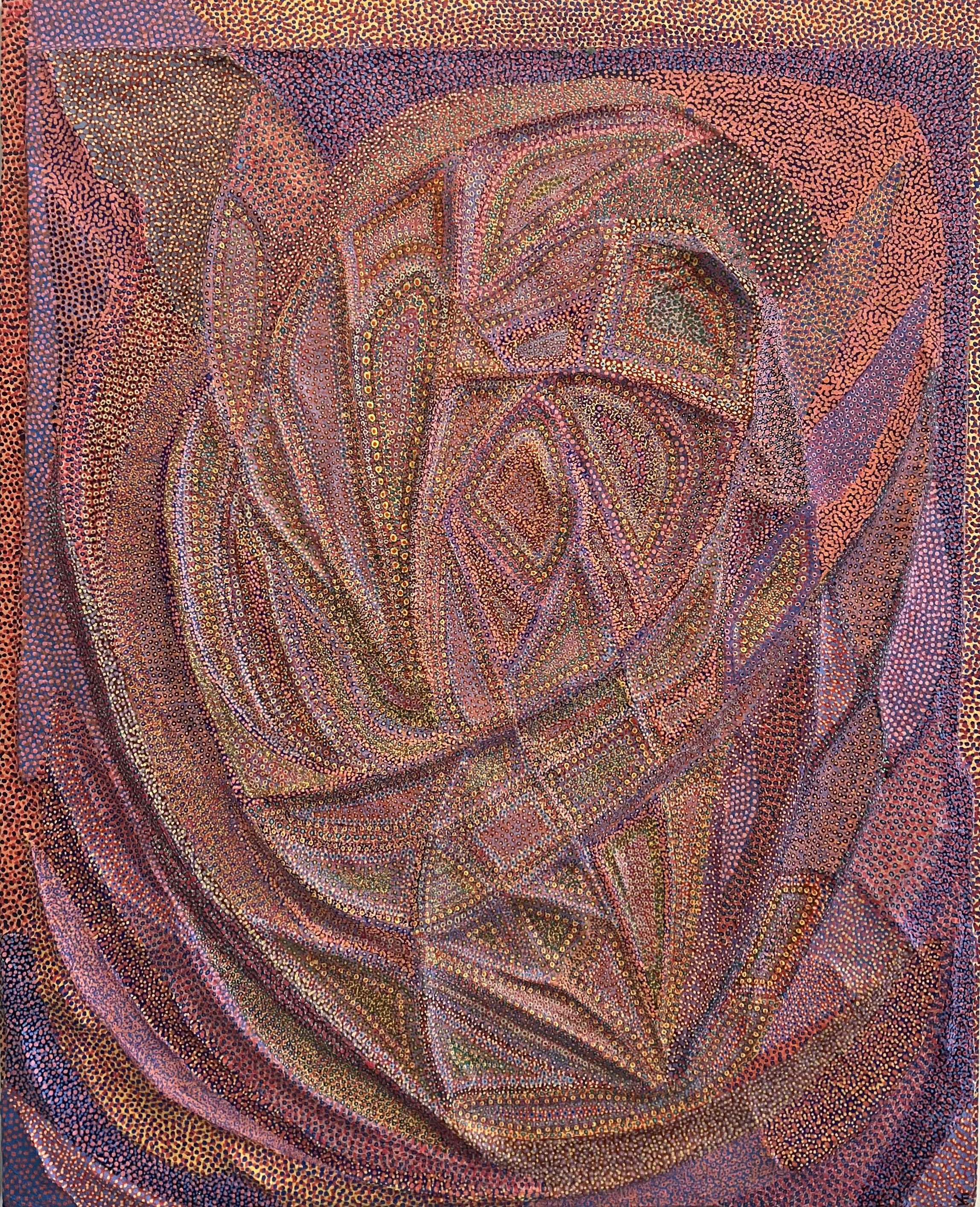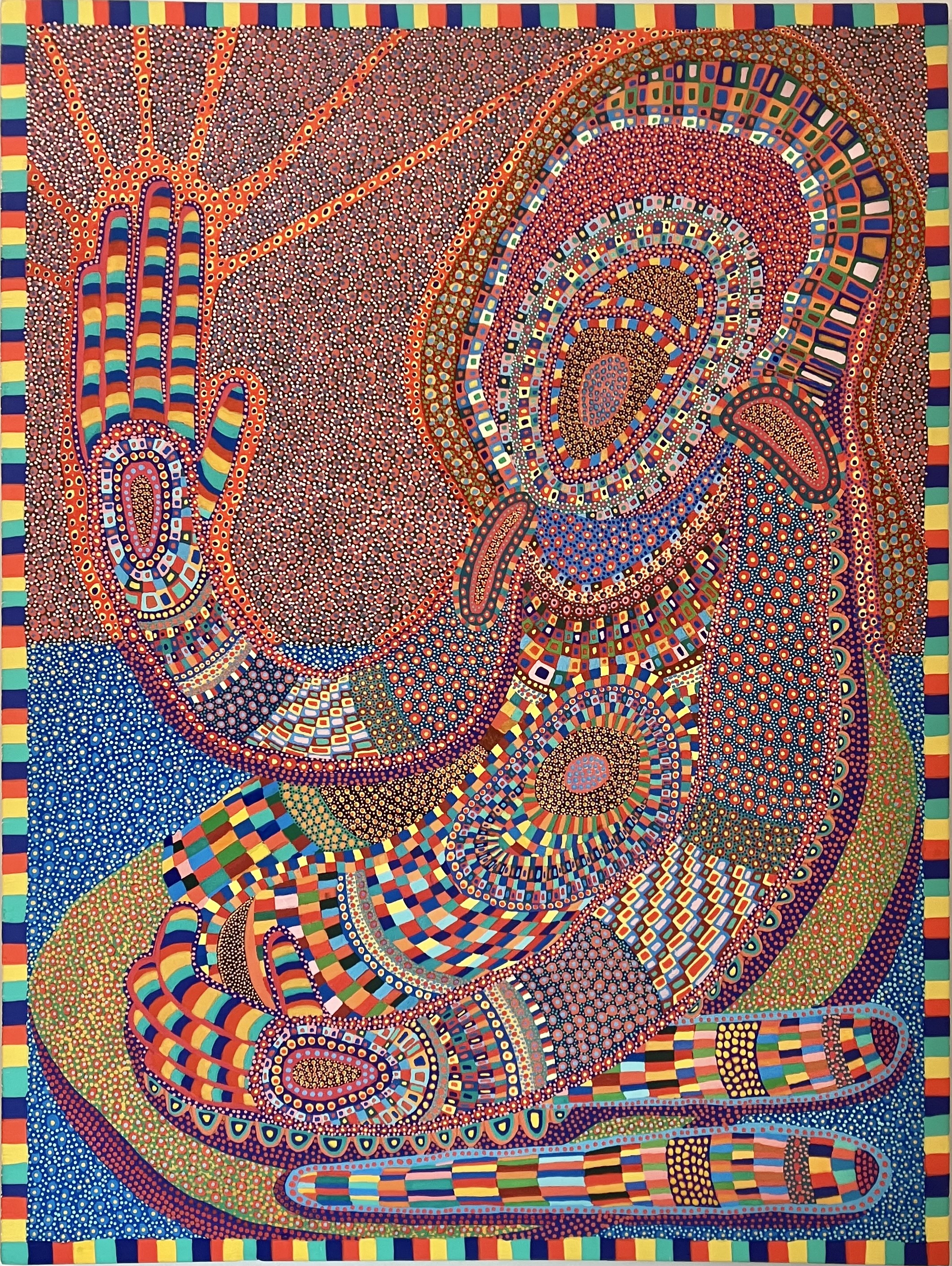 My process is involved and physical, I start big and work small. I am never beholden to my initial idea for a piece and instead rely on an intuitive process that begins with the creation of simple, organic shapes and activation through the repetition of lines, dashes, and circles.